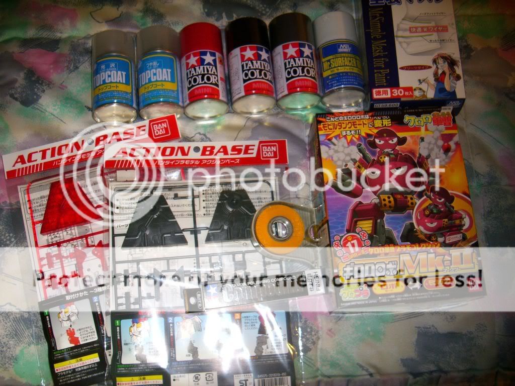 - la tercera foto es mi ultimo pedido a Rainbow Ten, son sprays de diferente tipo: color, imprimación y barniz, un par de bases para modelos, cinta para enmascarar de Tamiya, crema de pulido "saca brillo", una caja de mascarillas para pintar y una maqueta de Giroro Robot MKII para hacer.